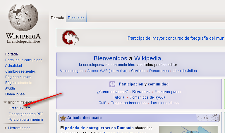 Primero accedemos a wikipedia en castellano, si queremos crear el ePub en este idioma, y habilitamos el creador de libros en el menú de la izquierda.
